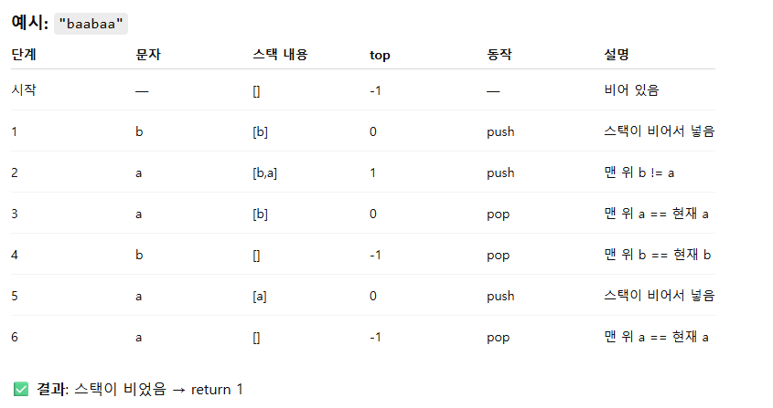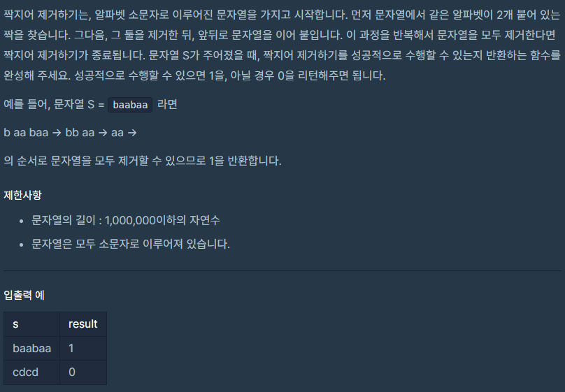 class Solution { public int solution(String s) { char[] st = new char[s.length()]; int top = -1; for (int i = 0; i < s.length(); i++) { char c = s.charAt(i); if (top >= 0 && st[top] == c) top--; // 인접 쌍 제거 else st[++top] = c; // 스택에 쌓기 } return top == -1 ? 1 : 0; } }