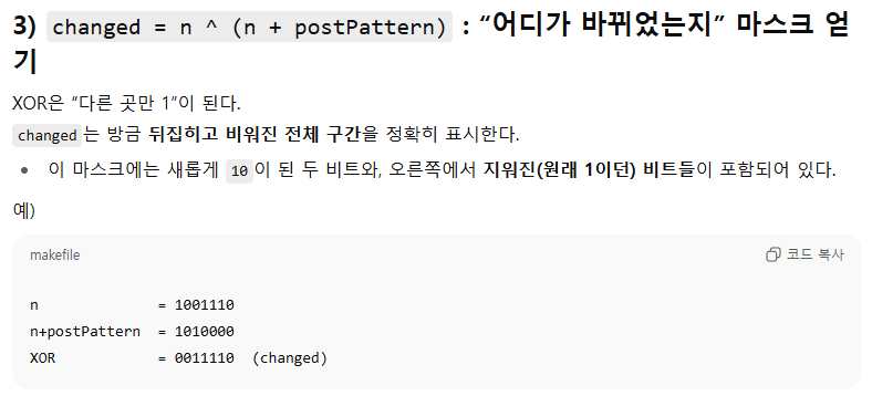 - n ^ (n + postPattern) : 변한 비트들만 1로 표시한 마스크를 얻는다