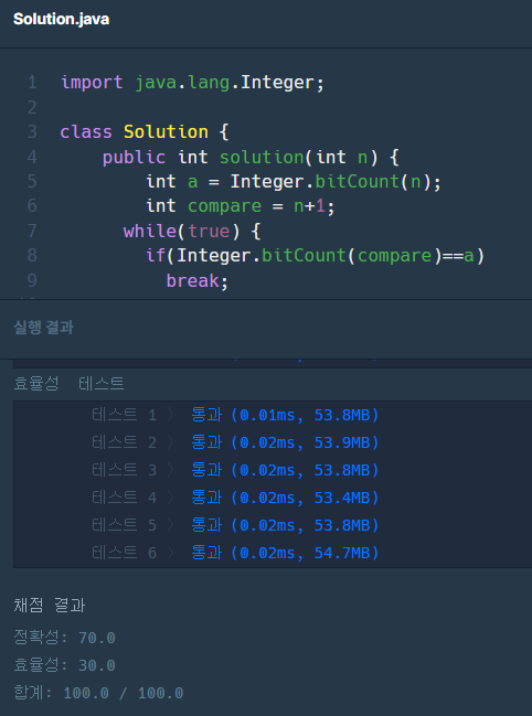 class Solution { public int solution(int n) { String binaryVal = Integer.toBinaryString(n); int oneCnt = countOne(binaryVal); int tmpCnt = 0; int answer = n; while (oneCnt != tmpCnt) { answer++; String tmpBinaryVal = Integer.toBinaryString(answer); tmpCnt = countOne(tmpBinaryVal); } return answer; } private int countOne(String binaryVal) { int answer = 0; String[] tmpStr = binaryVal.split(""); for (String x : tmpStr) { if (x.equals("1")) { answer += 1; } } return answer; } }