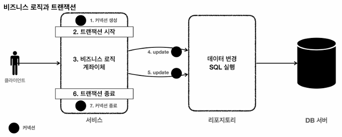 - 애플리케이션에서 같은 커넥션을 유지하기 위해 커넥션을 파라미터로 전달해서 같은 커넥션이 사용되도록 함