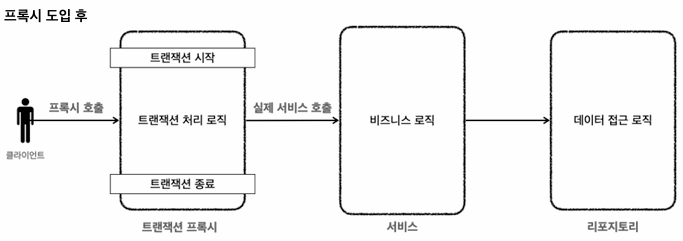 - 프록시를 사용하면 트랜잭션을 처리하는 객체와 비즈니스 로직을 처리하는 서비스 객체를 명확히 분리할 수 있다