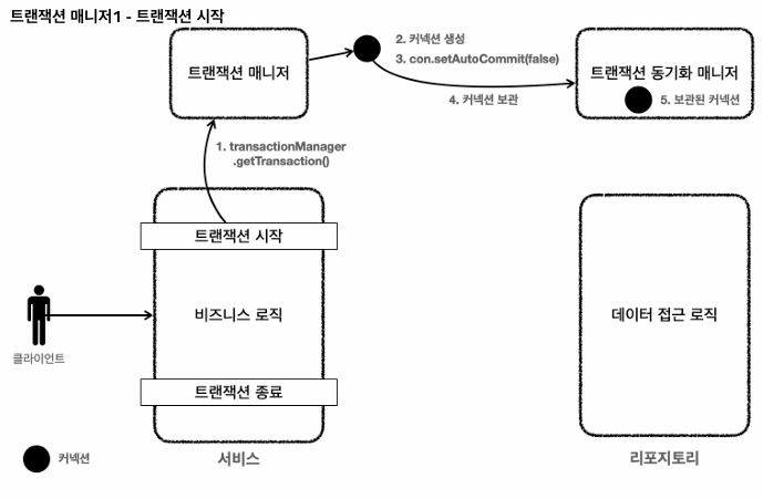 - 서비스 계층에서 transactionManger.getTransaction()을 호출해 트랜잭션 시작