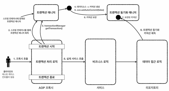 - 비즈니스 로직 끝나면 트랜잭션을 종료하고 트랜잭션은 커밋/롤백하면 종료