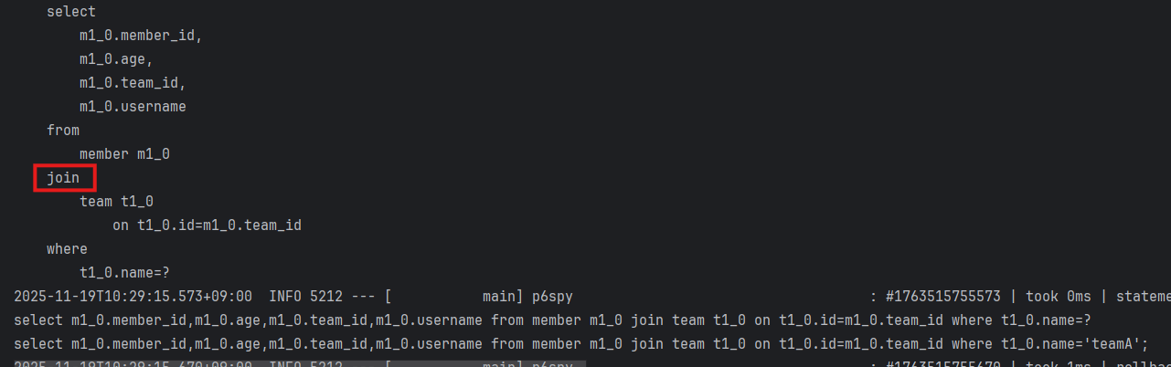 /** * 팀 A에 소속된 모든 회원 */ @Test public void join() throws Exception { QMember member = QMember.member; QTeam team = QTeam.team; List<Member> result = queryFactory .selectFrom(member) .join(member.team, team) .where(team.name.eq("teamA")) .fetch(); assertThat(result) .extracting("username") .containsExactly("member1", "member2"); }