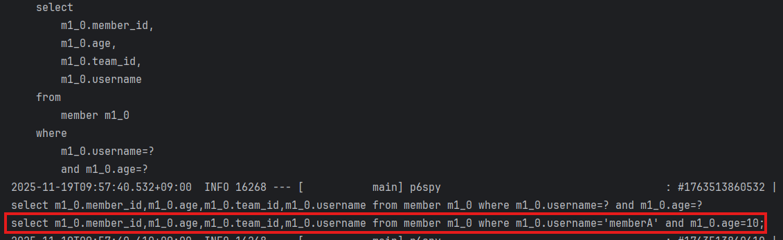 QMember qMember = new QMember("m"); // 별칭 직접 지정 QMember qMember = QMember.member; // 기본 인스턴스 사용- 실행되는 JPQL 확인