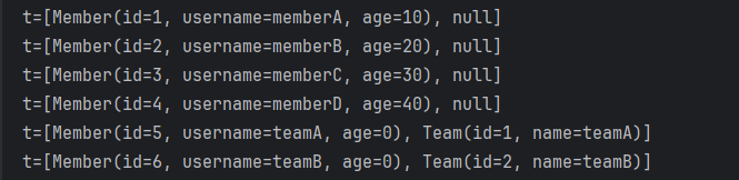 @Test public void searchAndParam() { List<Member> result1 = queryFactory .selectFrom(member) .where(member.username.eq("member1"), member.age.eq(10)) .fetch(); assertThat(result1.size()).isEqualTo(1); }결과 조회