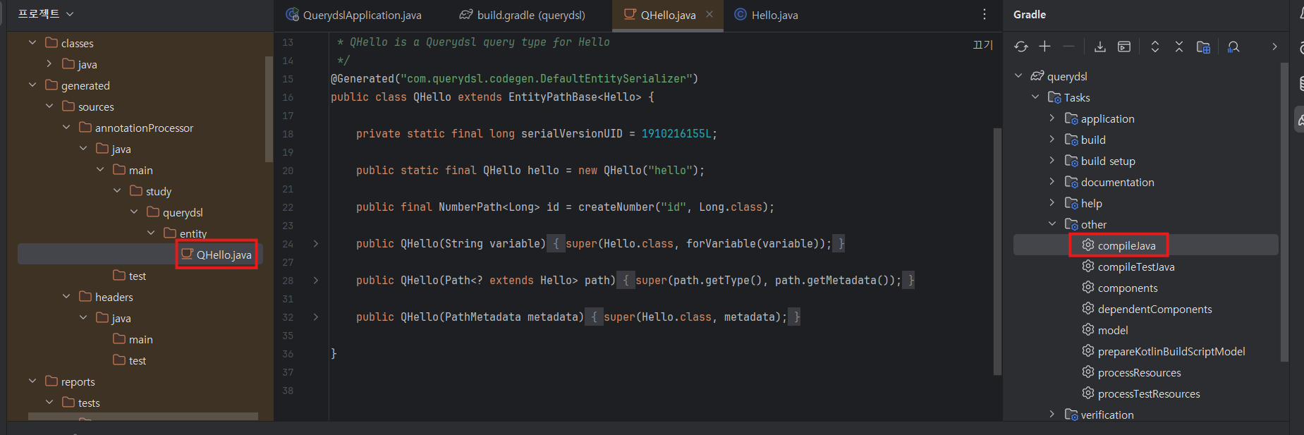 - gradle > tasks > other > compileJava (임의지정이름) 클릭 > QClass 생성