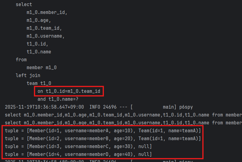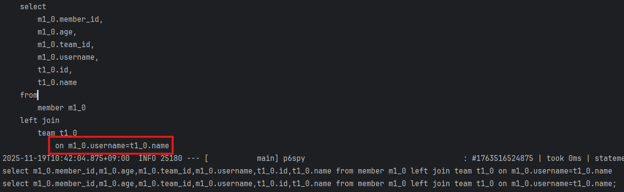 /** * 세타 조인(연관관계가 없는 필드로 조인) * 회원의 이름이 팀 이름과 같은 회원 조회 */ @Test public void theta_join() throws Exception { em.persist(new Member("teamA")); em.persist(new Member("teamB")); List<Member> result = queryFactory .select(member) .from(member, team) .where(member.username.eq(team.name)) .fetch(); assertThat(result) .extracting("username") .containsExactly("teamA", "teamB"); }- from 절에 여러 엔티티를 선택해서 세타 조인