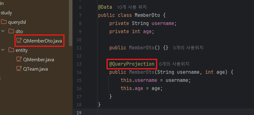 @Test public void findDtoByConstructor() { List<MemberDto> result = queryFactory .select(Projections.constructor(MemberDto.class, member.username, member.age)) .from(member) .fetch(); for (MemberDto dto : result) { System.out.println("dto = " + dto); } }프로젝션과 결과 반환 - @QueryProjection