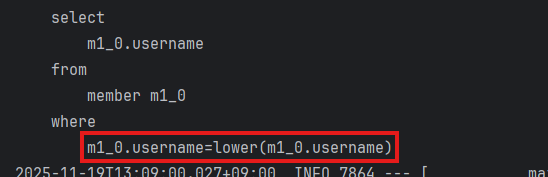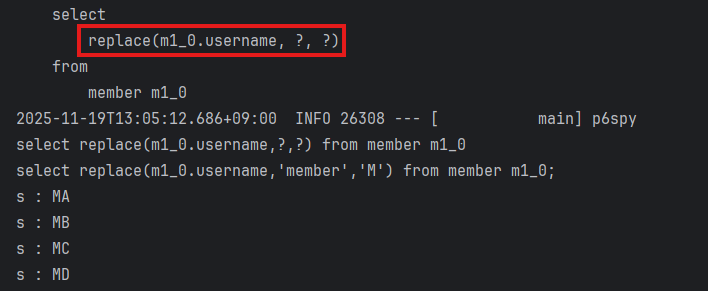 // member -> M 으로 변경하는 replace 함수 @Test public void sqlFunction() { List<String> result = queryFactory .select(Expressions.stringTemplate("function('replace', {0}, {1}, {2})", member.username, "member", "M")) .from(member) .fetch(); for (String s : result) { System.out.println("s : " + s); } } // 소문자로 변경해서 비교 @Test public void sqlFunction2() { List<String> result = queryFactory .select(member.username) .from(member) // .where(member.username.eq( // Expressions.stringTemplate("function('lower', {0})", member.username))) .where(member.username.eq(member.username.lower())) .fetch(); for (String s : result) { System.out.println("s : " + s); } }