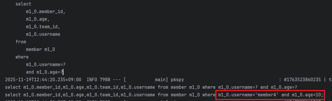 @Test public void dynamicQuery_BooleanBuilder() { String usernameParam = "memberA"; Integer ageParam = 10; List<Member> result = searchMember1(usernameParam, ageParam); assertThat(result.size()).isEqualTo(1); } private List<Member> searchMember1(String usernameCond, Integer ageCond) { BooleanBuilder builder = new BooleanBuilder(); if (usernameCond != null) { builder.and(member.username.eq(usernameCond)); } if (ageCond != null) { builder.and(member.age.eq(ageCond)); } return queryFactory.selectFrom(member).where(builder).fetch(); }