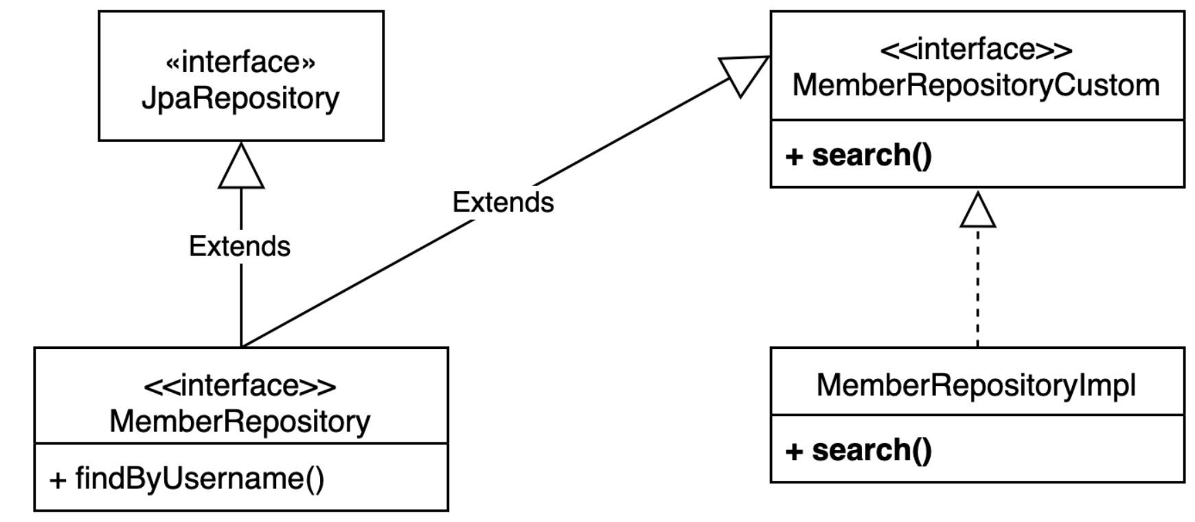 public interface MemberRepositoryCustom { List<MemberTeamDto> search(MemberSearchCondition condition); }2. 사용자 정의 인터페이스 구현