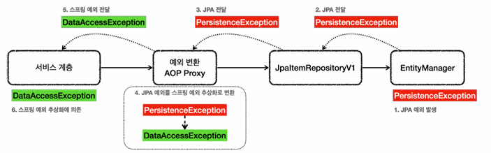- 예외 변환 AOP 프록시는 JPA 관련 예외가 발생하면 JPA 예외 변환기를 통해 발생한 예외를 스프링 데이터 접근 예외로 변환한다