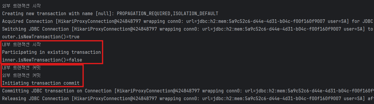 @Test void inner_commit() { log.info("외부 트랜잭션 시작"); TransactionStatus outer = txManager.getTransaction(new DefaultTransactionAttribute()); log.info("outer.isNewTransaction()={}", outer.isNewTransaction()); log.info("내부 트랜잭션 시작"); TransactionStatus inner = txManager.getTransaction(new DefaultTransactionAttribute()); log.info("inner.isNewTransaction()={}", inner.isNewTransaction()); log.info("내부 트랜잭션 커밋"); txManager.commit(inner); log.info("외부 트랜잭션 커밋"); txManager.commit(outer); }