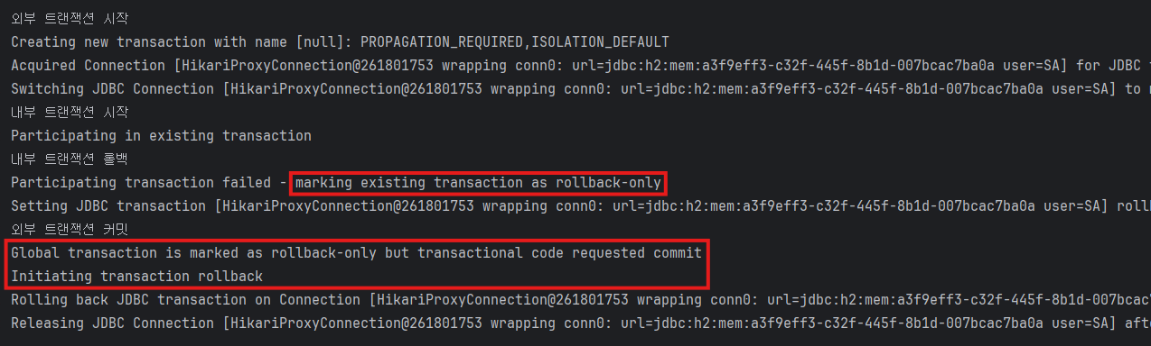 - 외부 트랜잭션을 커밋할 때 UnexpectedRollbackException이 발생한다