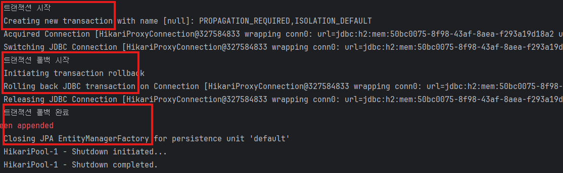 @Test void rollback() { log.info("트랜잭션 시작"); TransactionStatus status = txManager.getTransaction(new DefaultTransactionDefinition()); log.info("트랜잭션 롤백 시작"); txManager.rollback(status); log.info("트랜잭션 롤백 완료"); }