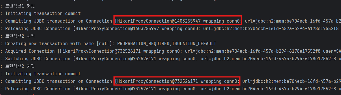 - 히카리 커넥션이 풀이 반환해주는 커넥션을 다루는 프록시 객체의 주소가 서로 다르다
