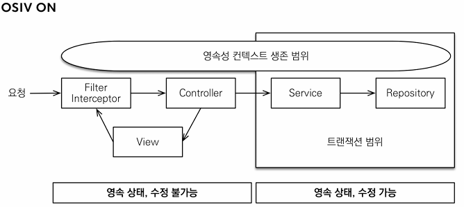 - OSIV 전략은 트랜잭션 시작처럼 최초 데이터베이스 커넥션 시작 시점부터 API 응답이 끝날 때까지 영속성 컨텍스트 와 데이터베이스 커넥션을 유지한다