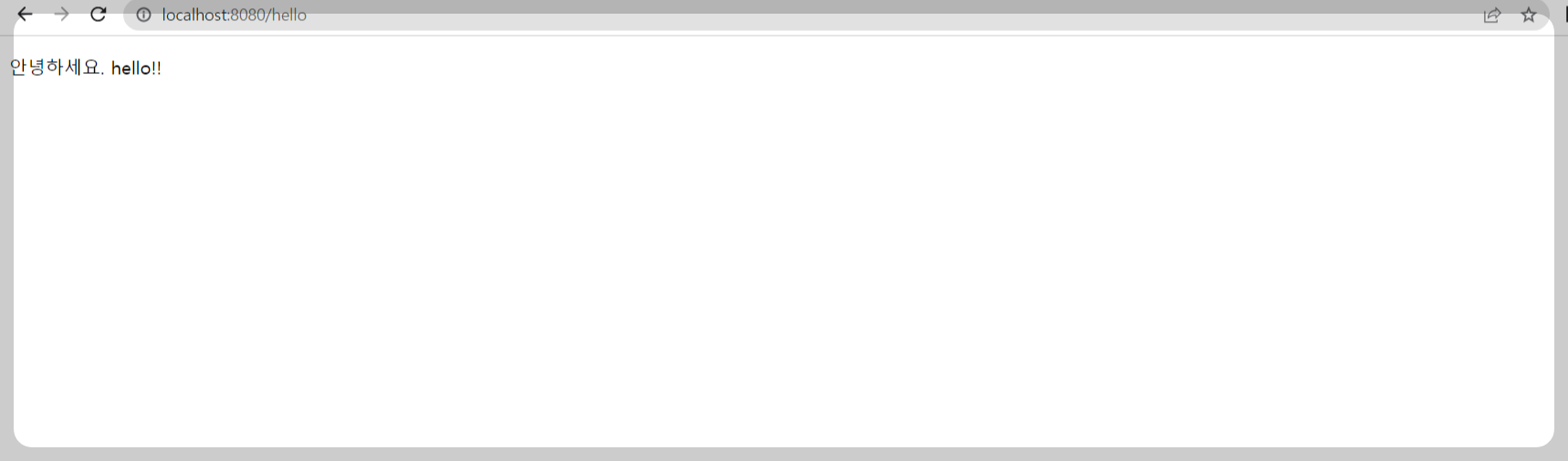 @Controller public class HelloController { @GetMapping("hello") public String hello(Model model) { model.addAttribute("data", "hello!!"); return "hello"; } }<!DOCTYPE HTML> <html xmlns:th="http://www.thymeleaf.org"> <head> <title>Hello</title> <meta http-equiv="Content-Type" content="text/html; charset=UTF-8" /> </head> <body> <p th:text="'안녕하세요. ' + ${data}" >안녕하세요. 손님</p> </body> </html>