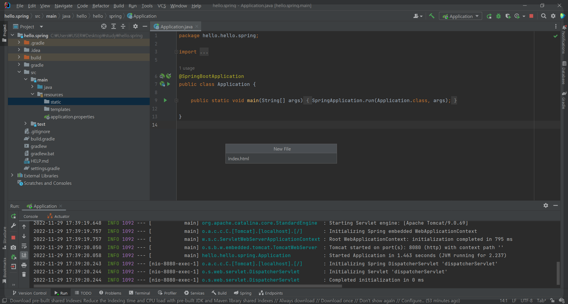1) src > main > resourcese > static 폴더 >> (new > file > index.html)