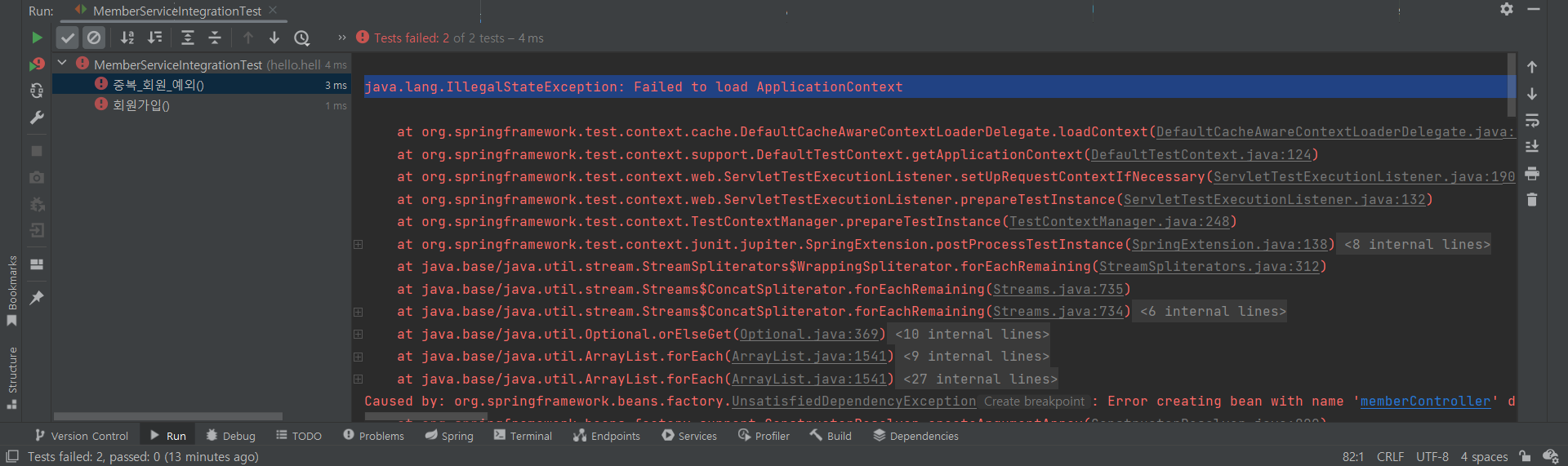 @Configuration public class SpringConfig { private final DataSource dataSource; public SpringConfig(DataSource dataSource) { this.dataSource = dataSource; } @Bean public MemberService memberService() { return new MemberService(memberRepository()); } @Bean public MemberRepository memberRepository() { // return new MemoryMemberRepository(); // return new JdbcMemberRepository(dataSource); return new JdbcTemplateMemberRepository(dataSource); } }public class JdbcTemplateMemberRepository implements MemberRepository { private final JdbcTemplate jdbcTemplate; //생성자가 1개일 때, @Autowired 생략 가능 //@Autowired public JdbcTemplateMemberRepository(DataSource dataSource) { jdbcTemplate = new JdbcTemplate(dataSource); } @Override public Member save(Member member) { SimpleJdbcInsert jdbcInsert = new SimpleJdbcInsert(jdbcTemplate); jdbcInsert.withTableName("member").usingGeneratedKeyColumns("id"); Map<String, Object> parameters = new HashMap<>(); parameters.put("name", member.getName()); Number key = jdbcInsert.executeAndReturnKey(new MapSqlParameterSource(parameters)); member.setId(key.longValue()); return member; } @Override public Optional<Member> findById(Long id) { List<Member> result = jdbcTemplate.query("select * from member where id = ?", memberRowMapper(), id); return result.stream().findAny(); } @Override public Optional<Member> findByName(String name) { List<Member> result = jdbcTemplate.query("select * from member where name = ?", memberRowMapper(), name); return result.stream().findAny(); } @Override public List<Member> findAll() { return jdbcTemplate.query("select * from member", memberRowMapper()); } private RowMapper<Member> memberRowMapper() { //return new RowMapper<Member>() { // @Override // public Member mapRow(ResultSet rs, int rowNum) throws SQLException { // Member member = new Member(); // member.setId(rs.getLong("id")); // member.setName(rs.getString("name")); // return member; // }}; //alt + enter 로 lambda로 변형 return (rs, rowNum) -> { Member member = new Member(); member.setId(rs.getLong("id")); member.setName(rs.getString("name")); return member; }; } }하지만... 테스트를 실행해보면 오류가 발생한다