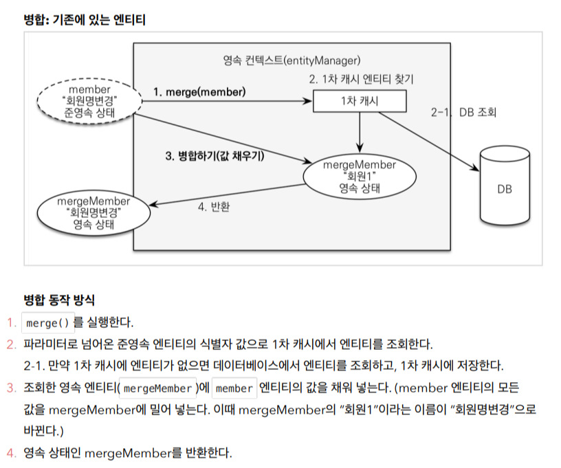- 주의점 : 변경 감지 기능을 사용하면 원하는 속성만 선택해서 변경할 수 있지만, 병합을 사용하면 모든 속성이 변경된다. 병합시 값이 없으면 null로 업데이트할 위험도 있다. (병합은 모든 필드를 교체한다.)